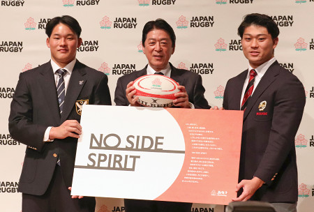 ラグビーの2035年W杯の開催地に立候補した日本協会は23日、招致に向けたメッセージが「NO SIDE SPIRIT」に決まったと発表した。写真は日本ラグビー協会の土田雅人会長(中央)ら。 【時事通信社】