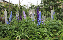 ここ数年はモルタルで作った童話「白雪姫」の世界観を表現した城などのアート作品を設置。今年は新たに、高さ約2メートル50センチ、幅約4メートル50センチの「小人の家の入り口」と題するアートや、アンティークの雑貨を生かす高さ約1メートル80センチ、幅約2メートルのアートを新設している。陰になりバラを育てにくいエリアには、日の当たる高さの切り株状のアートを設置。その上にミニバラの鉢植えを置く。