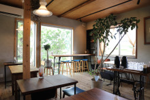 店は、もともと同所にあった戸建ての基礎、柱、屋根以外をリノベーションした。店内は戸建ての柱を生かしたり、壁は夫妻でしっくいを塗ったり、カウンターや長テーブルには福島産のミズナラの原木を使ったりして、自然やぬくもりを表現した。江利奈さんは「新方川沿いで静かな環境。向かいの川沿いには桜並木があり、対岸は市街地。ここは、私たちにとって理想的な場所だった」と話す。