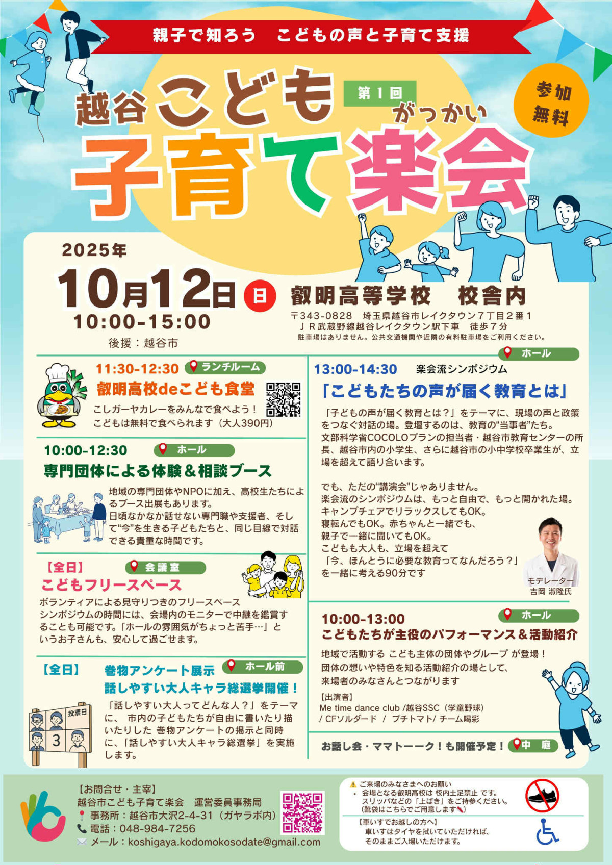 子育て支援イベント「越谷こども子育て楽会」が10月12日、叡明高校(越谷市レイクタウン7)で初めて開かれる。