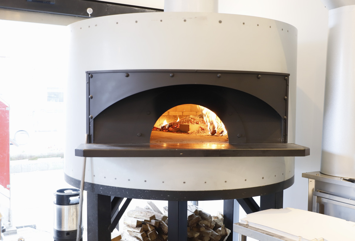 入り口を入って左側に設置。「まき窯で焼くと、軽くスモークされて香りに深みが出る」と店長の佐藤さん=草加にまき窯焼きのピザ店「ドゥエ ポルテ」