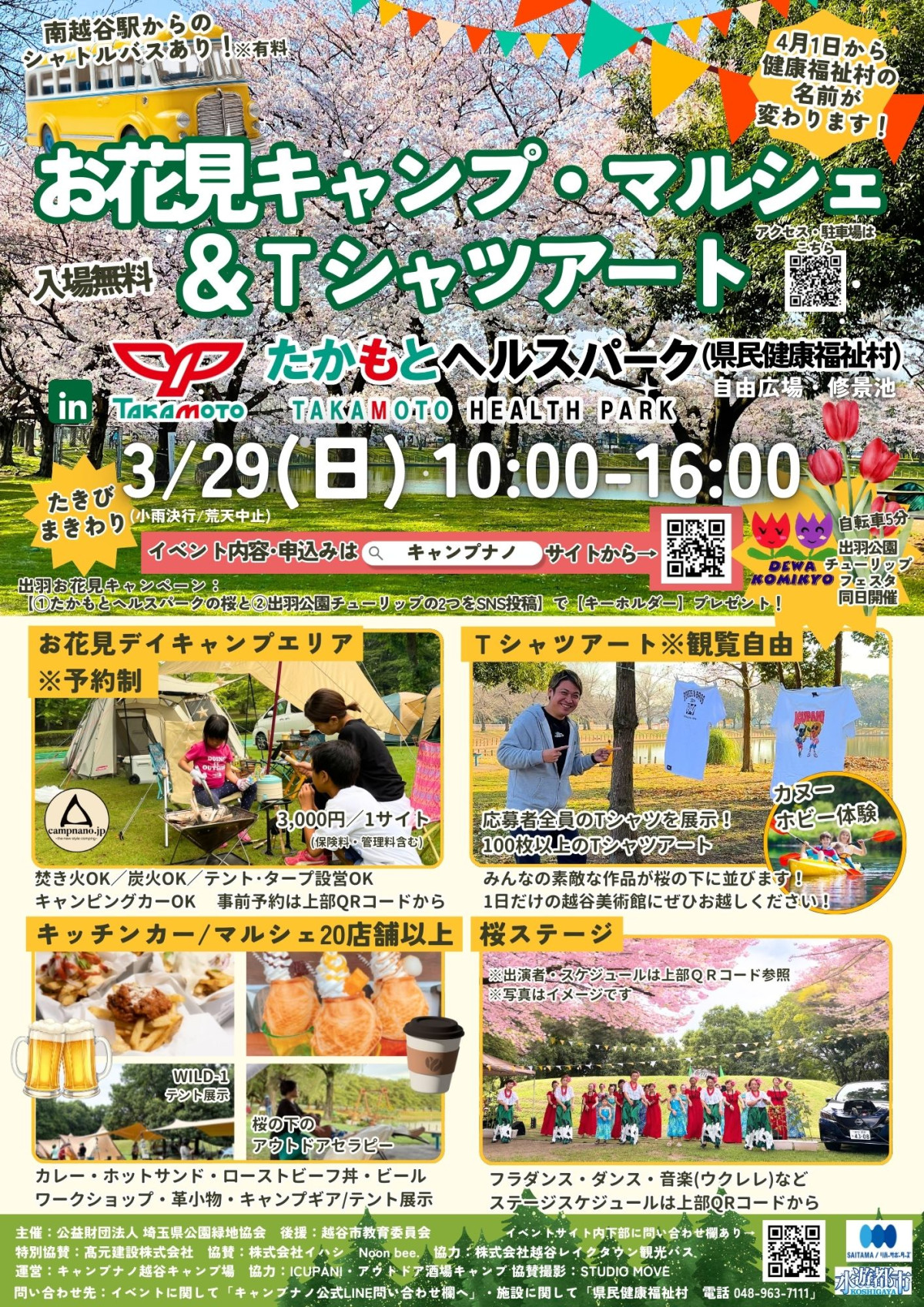 マルシェイベント「お花見キャンプ・マルシェ & Tシャツアート」が3月29日、県民健康福祉村(越谷市北後谷)で開かれる。