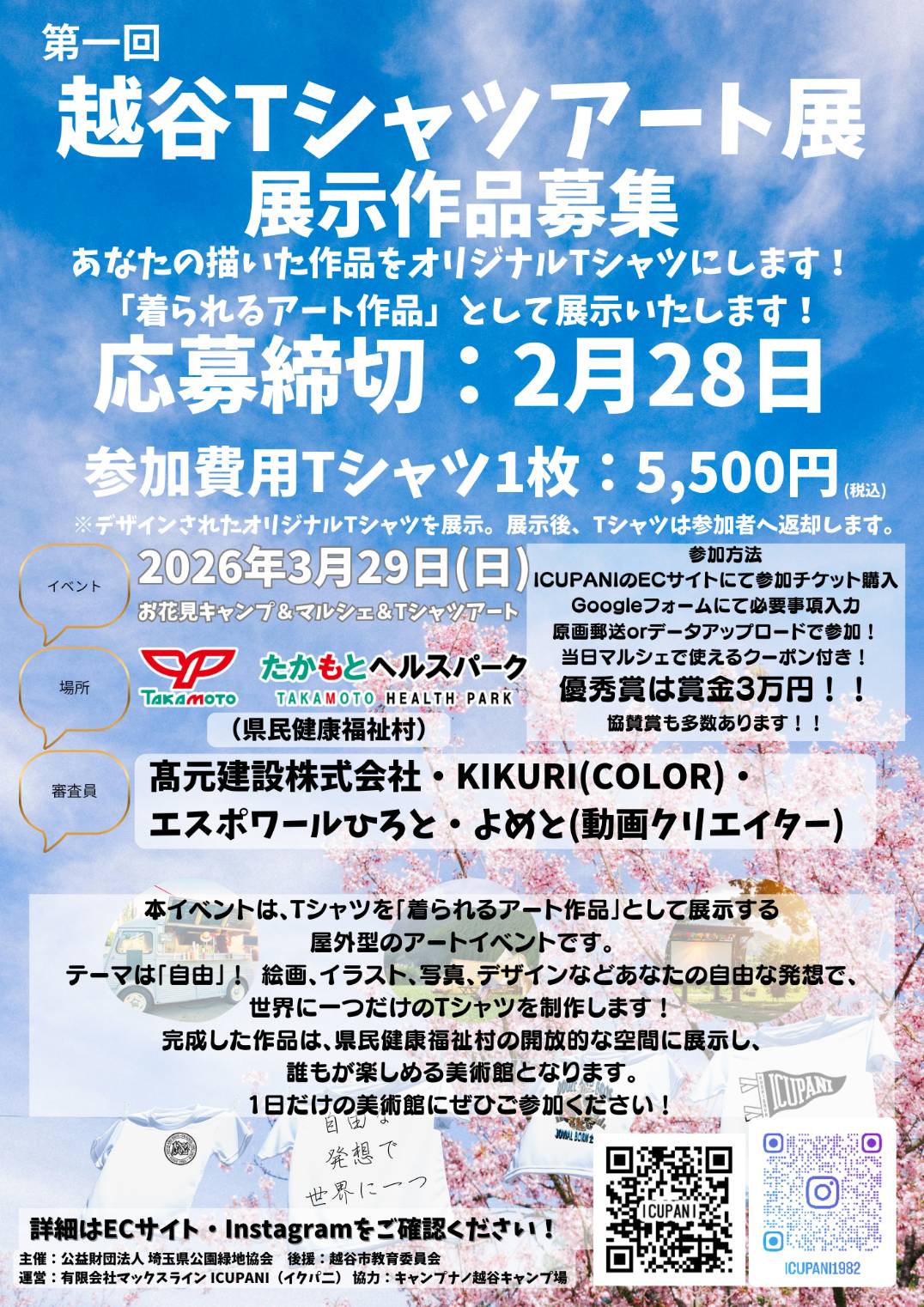 マルシェイベント「お花見キャンプ・マルシェ & Tシャツアート」が3月29日、県民健康福祉村(越谷市北後谷)で開かれる。